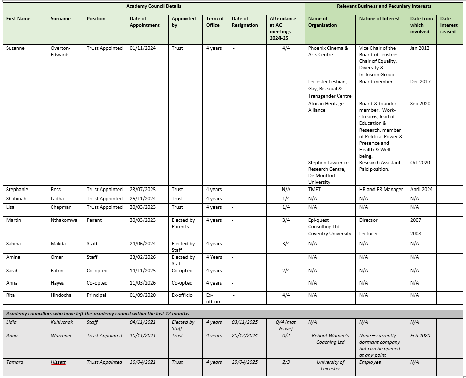 In line with good governance practice, academy councillors declare any business or personal interests that could be seen to influence their role. This helps ensure transparency, openness and integrity in decision-making.