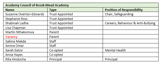 As part of The Mead Educational Trust (TMET), the Academy Council is the local tier of governance, providing local insight and assurance and acting as the eyes and ears of the Trust Board, feeding key information up so decisions are informed by what is happening in our school and the heart of our community.